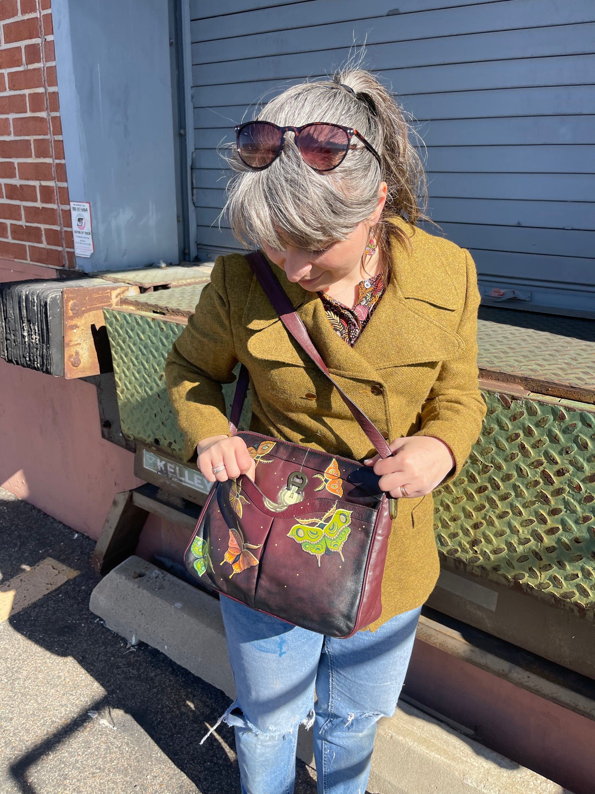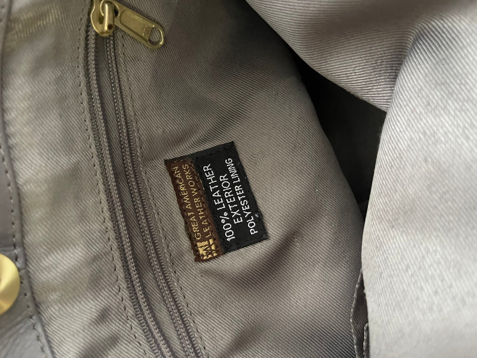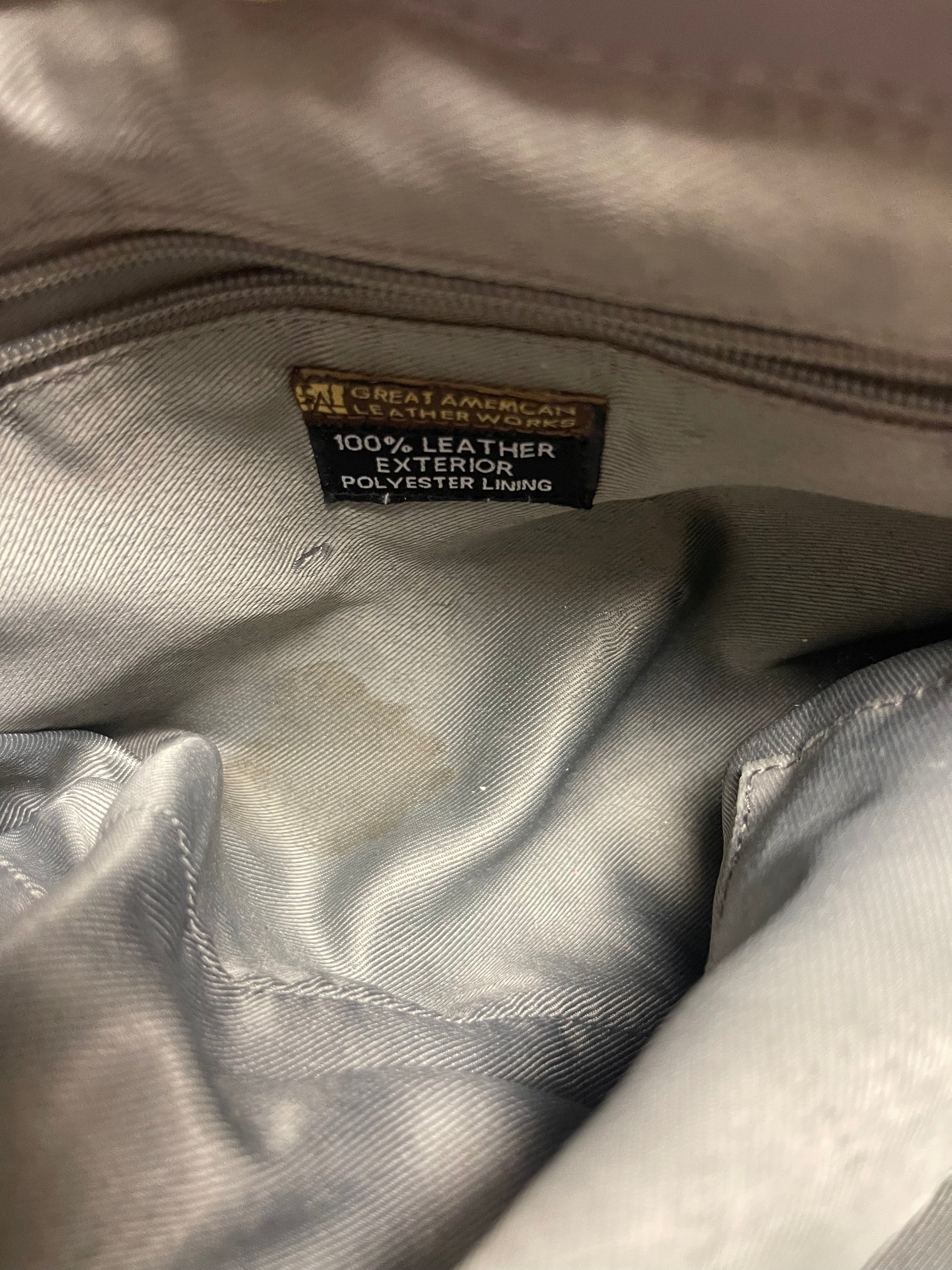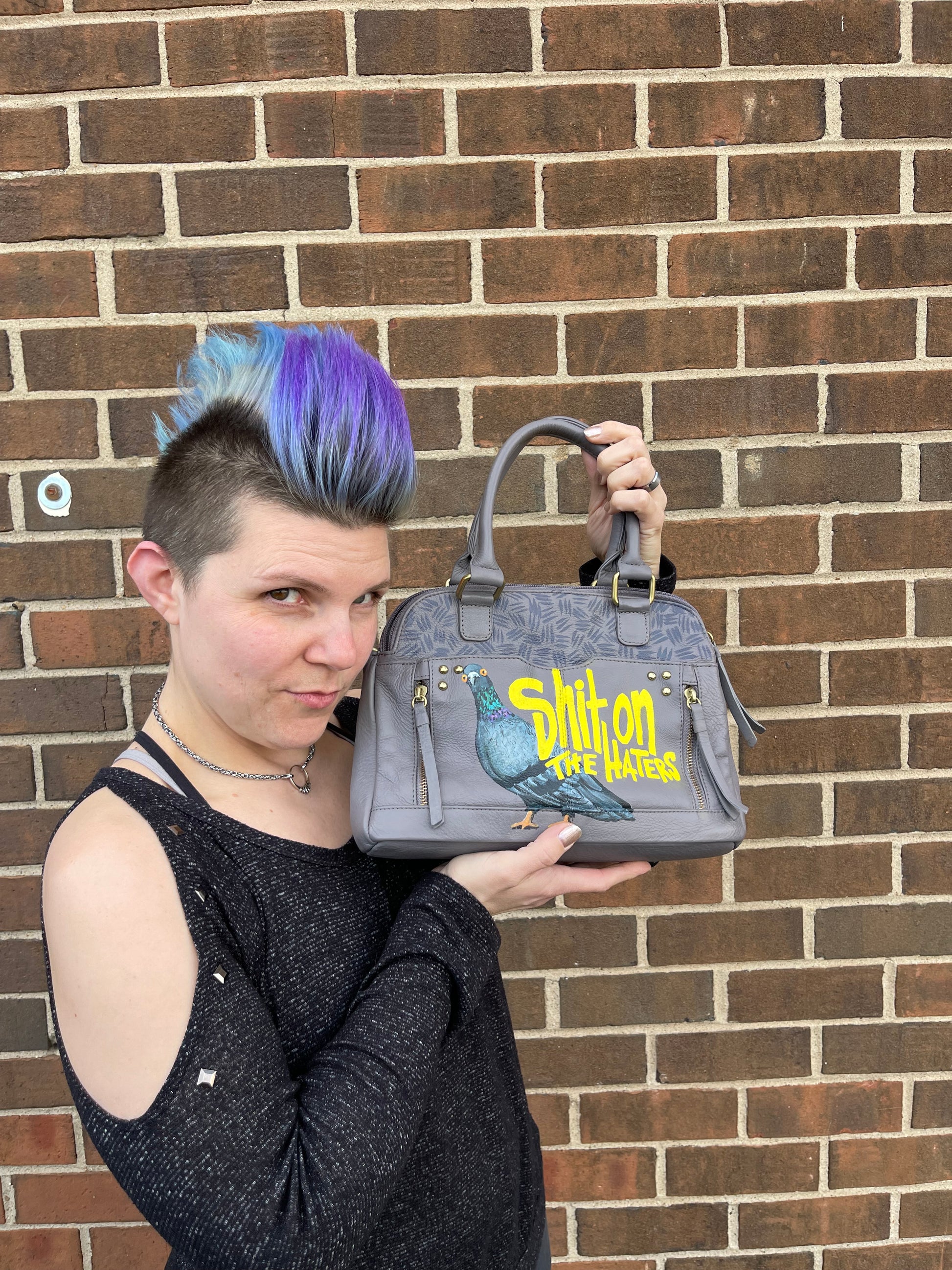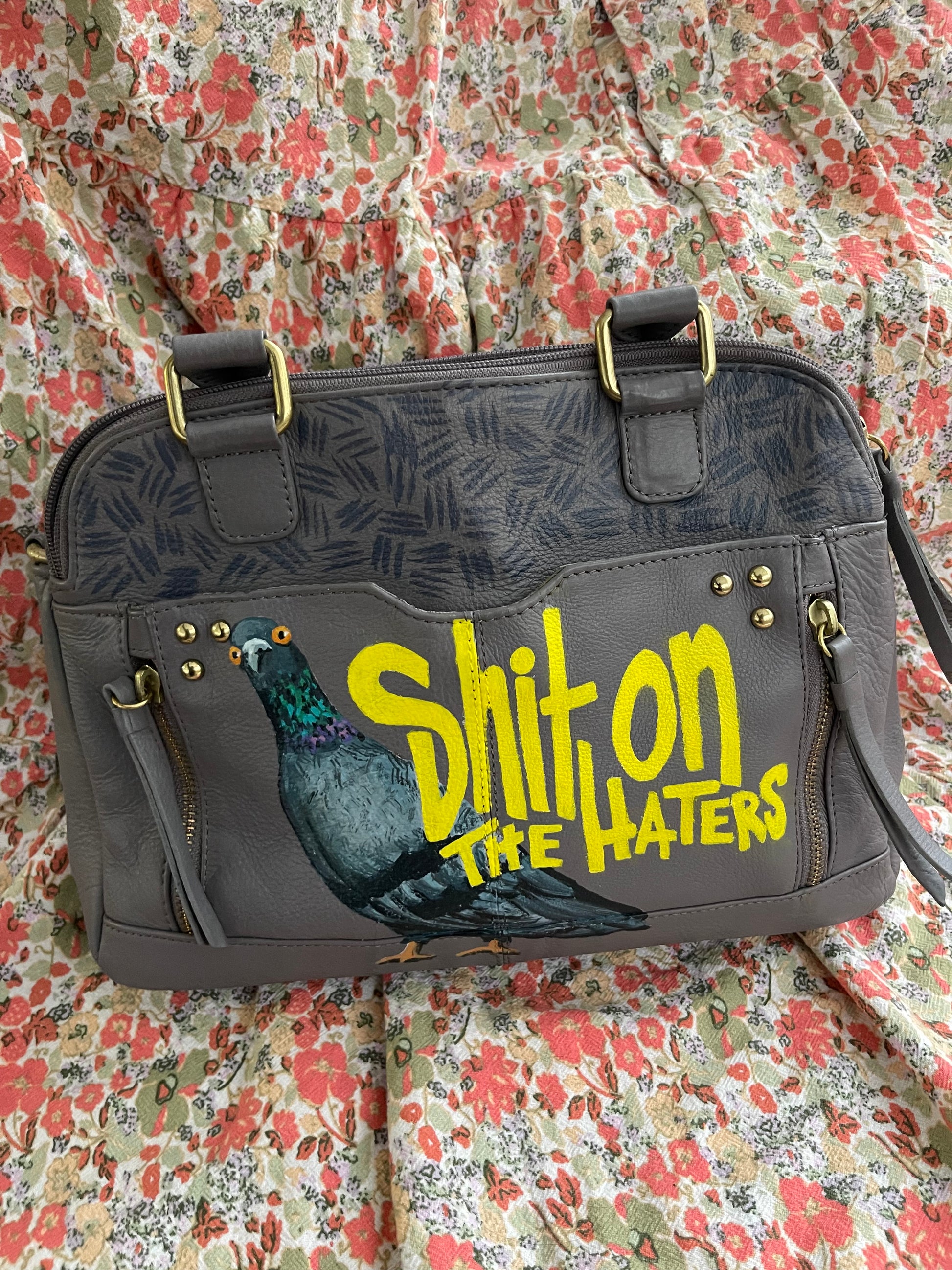 This upcycled Great America Leatherworks handbag channels bold attitude with a hand-painted cheeky pigeon perched defiantly on the front. The sleek gray leather and made-in-USA craftsmanship meet urban edge. You can tell this bag has a history by the small coffee stain on the interior lining (shown in product photo) showcasing this beloved piece has a lil’ grit around the edges—much like its future owner :)