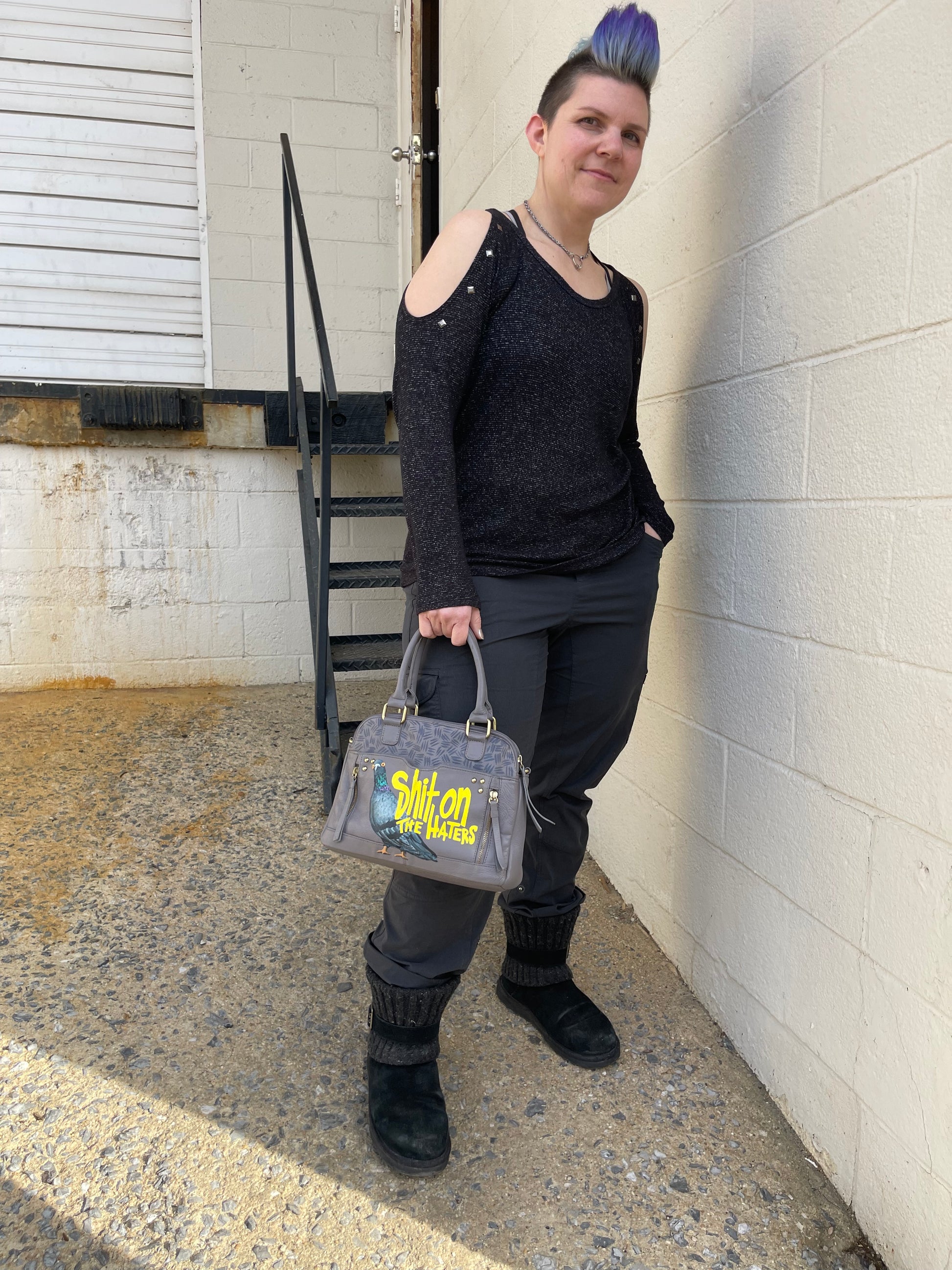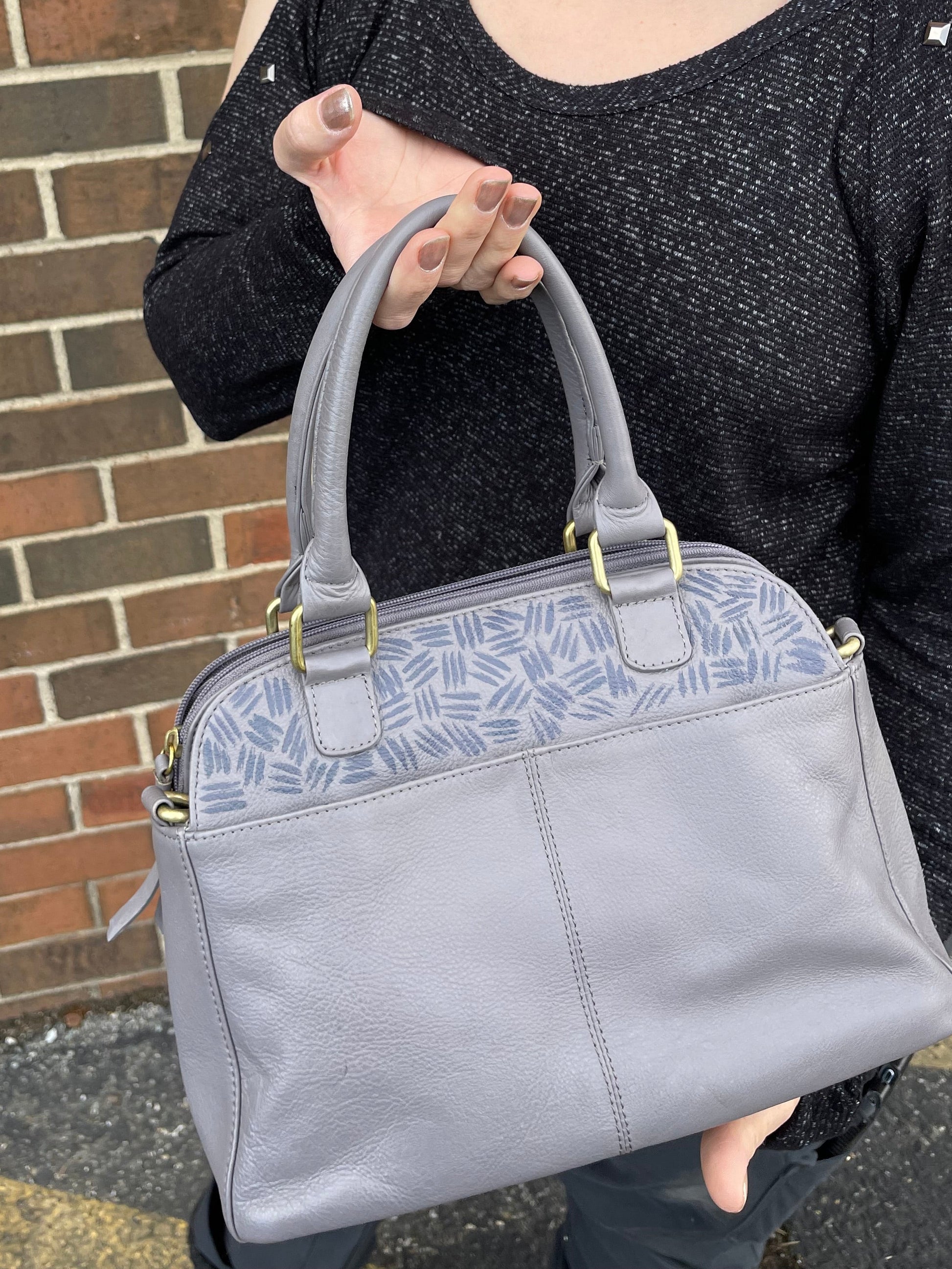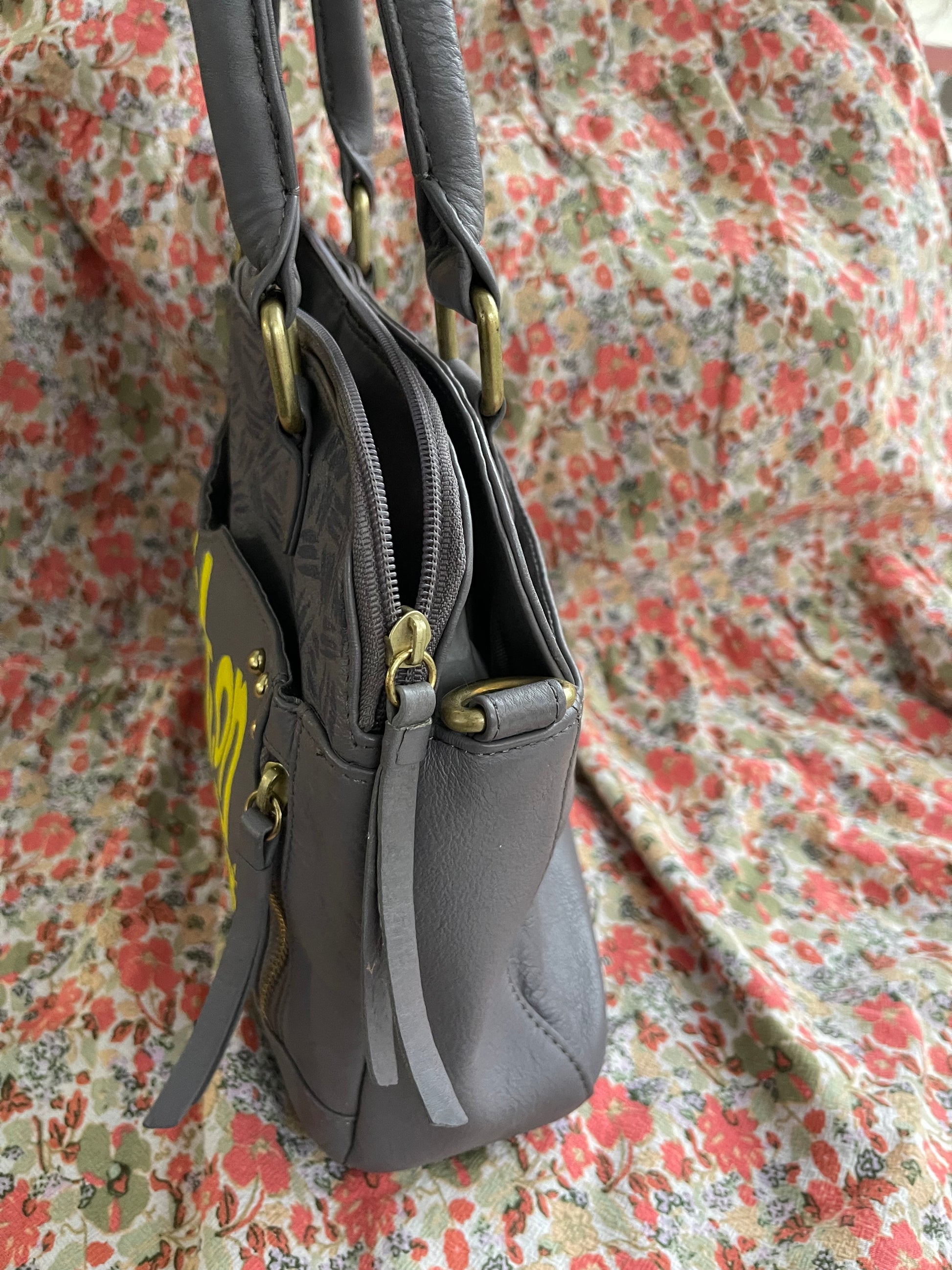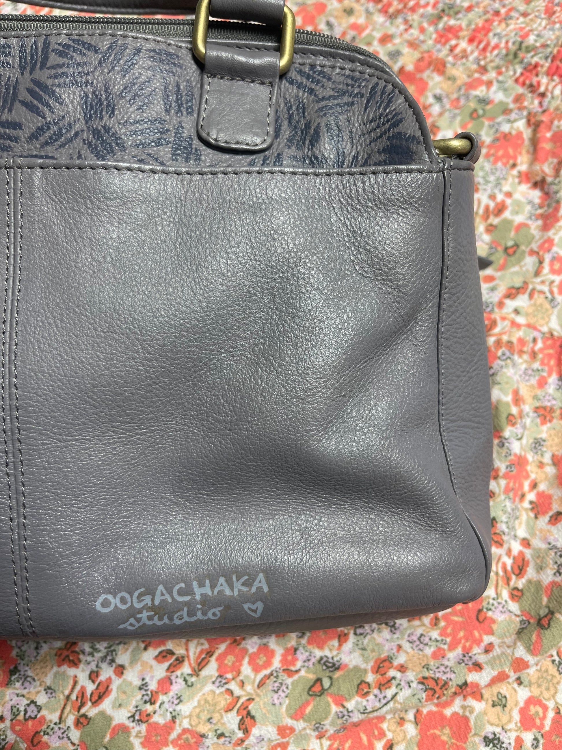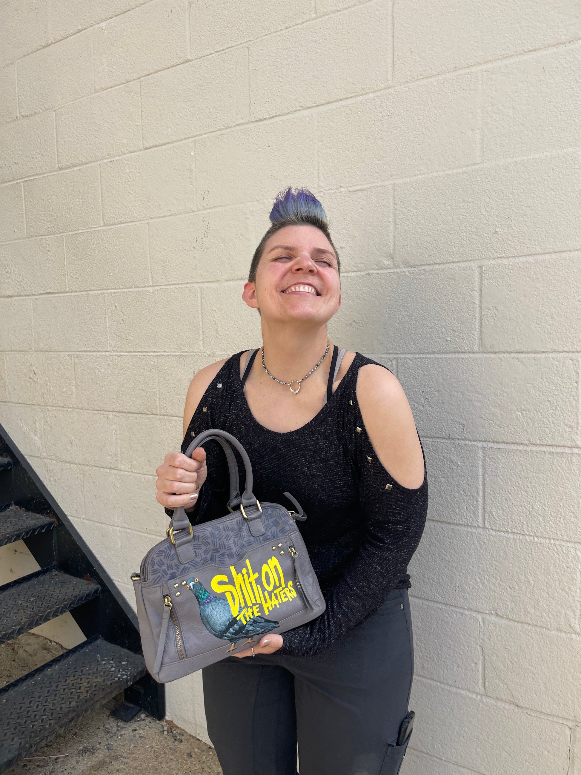This upcycled Great America Leatherworks handbag channels bold attitude with a hand-painted cheeky pigeon perched defiantly on the front. The sleek gray leather and made-in-USA craftsmanship meet urban edge. You can tell this bag has a history by the small coffee stain on the interior lining (shown in product photo) showcasing this beloved piece has a lil’ grit around the edges—much like its future owner :)